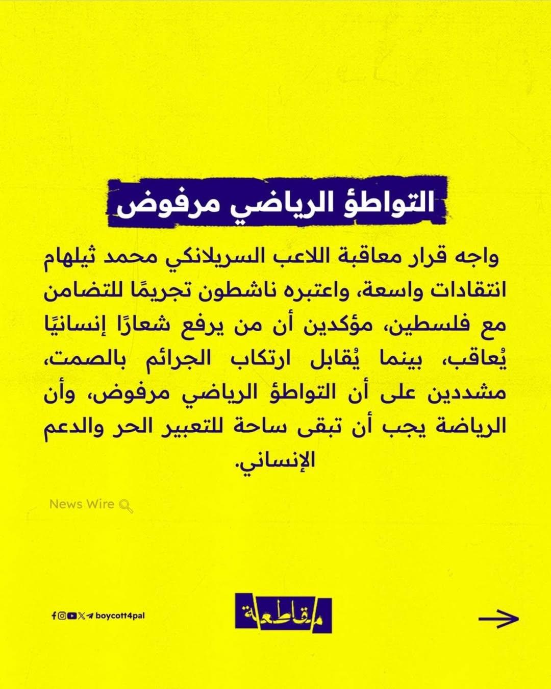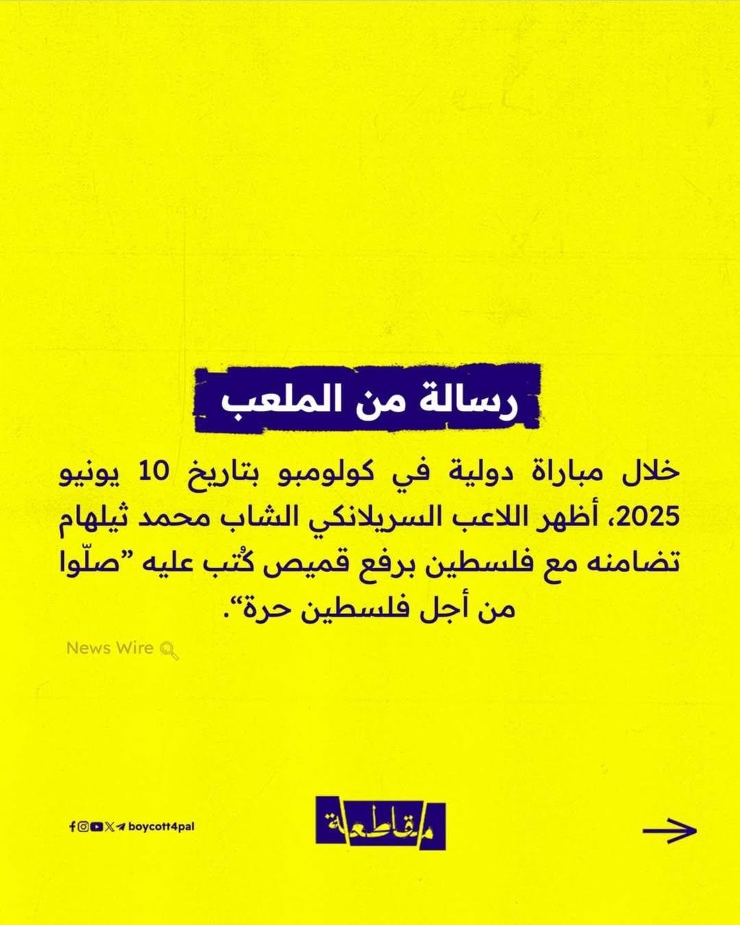 قرر الشاب السريلانكي محمد ثيلهام أن يرفع صوته من قلب ملعب عالمي، لا بكلمات، بل برسالة بسيطة: “صلوا من أجل فلسطين حرة”. لم يكن داخل المستطيل الأخضر لاعبًا في التشكيلة الأساسية، بل أحد البدلاء، لكن رسالته سجلت هدفًا أبعد من حدود الرياضة.