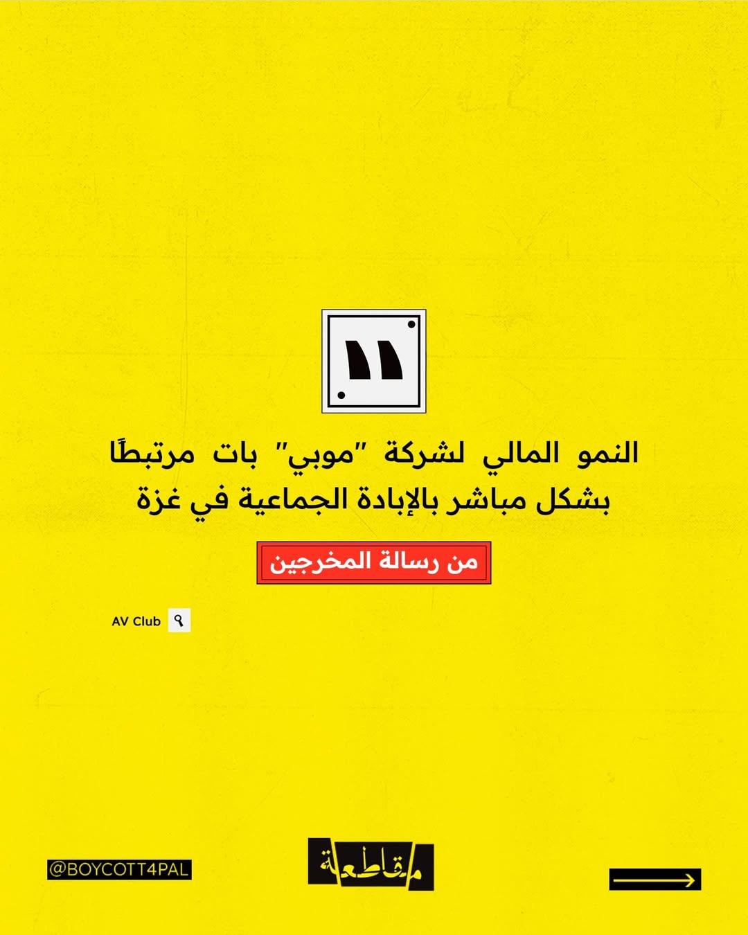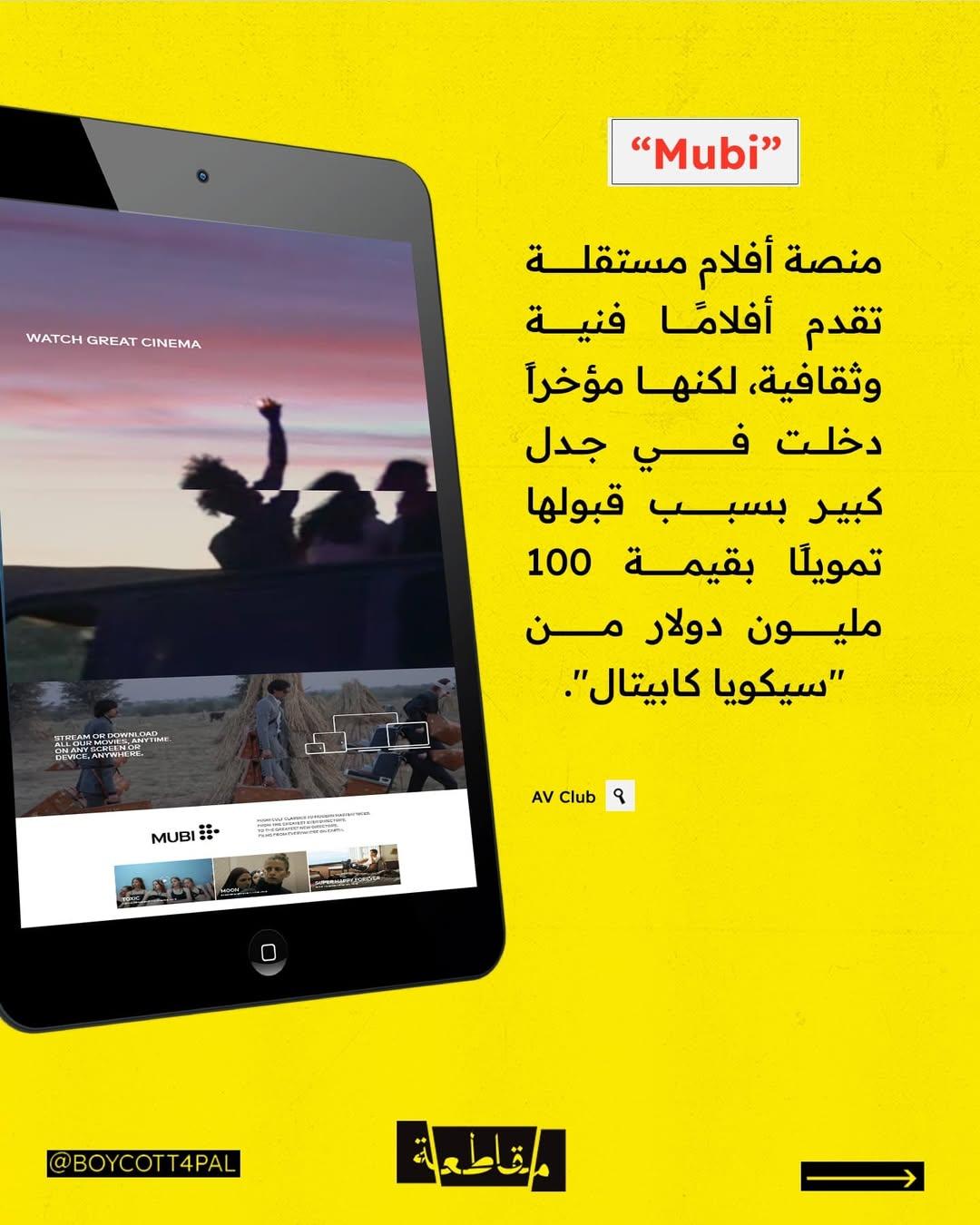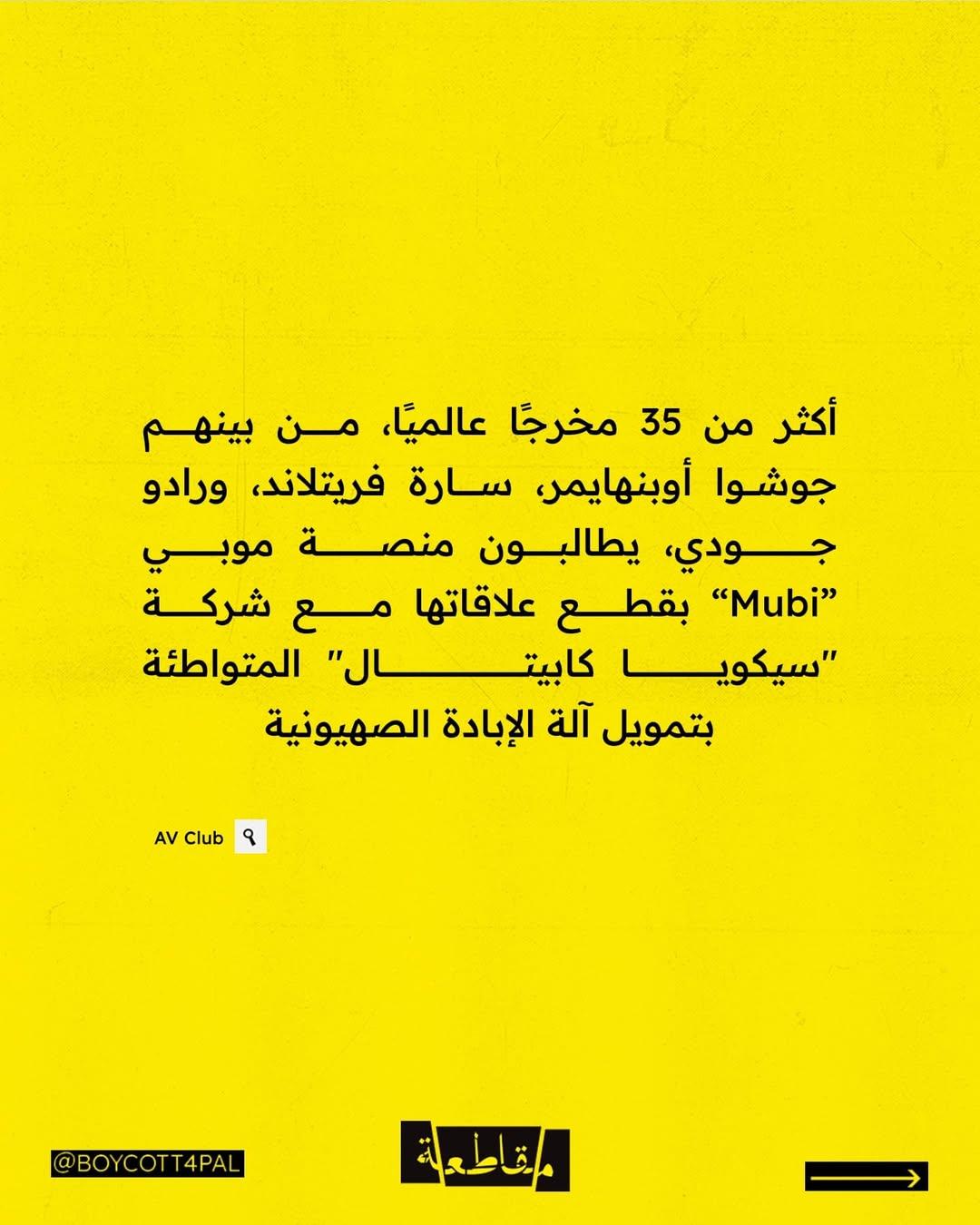 مخرجون عالميون أعلنوا مقاطعتهم لمنصة “الموبي” التي تبث أفلامًا فنية وثقافية، بعدما كشفت عن قبولها تمويلاً من شركة متواطئة في جريمة الإبادة.