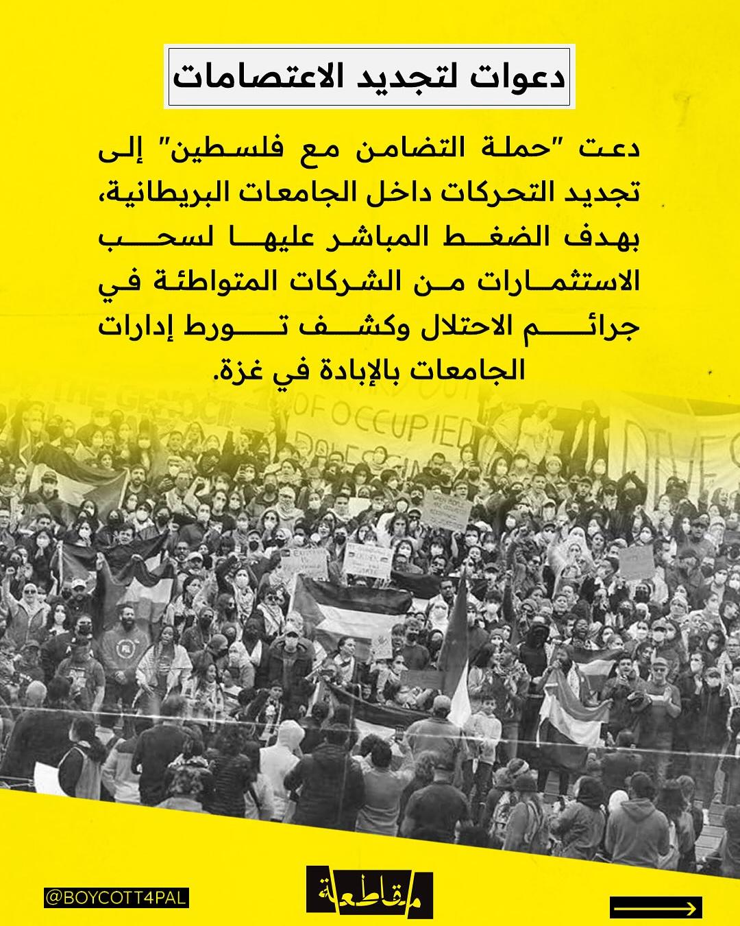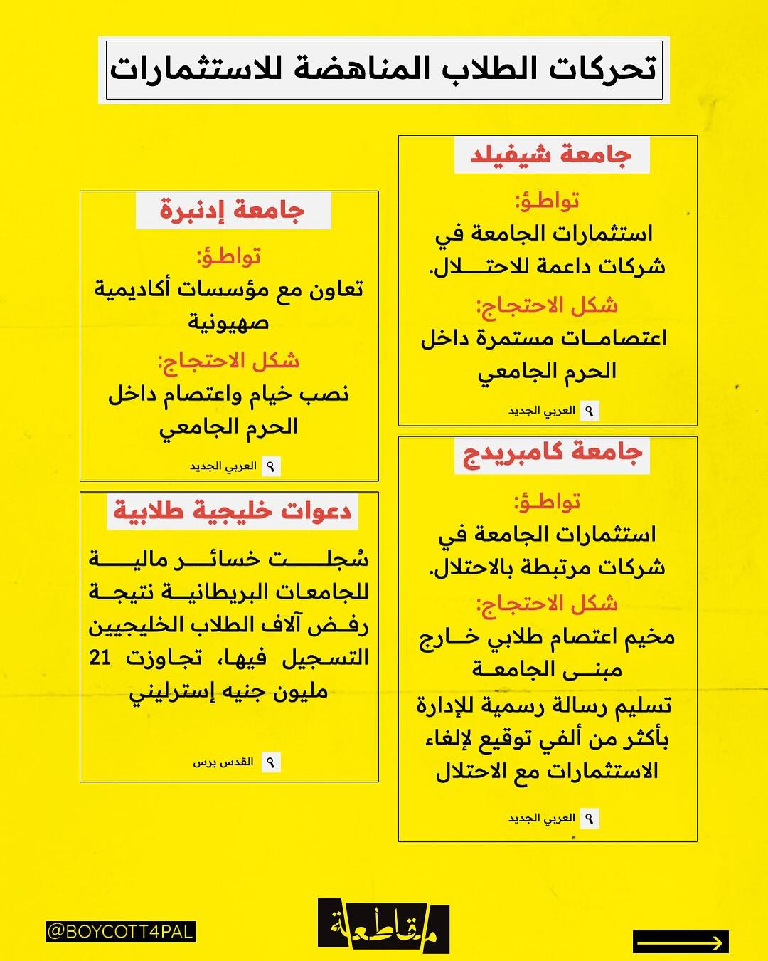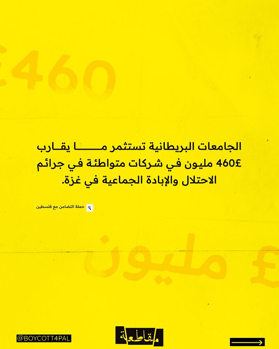 في ظل استمرار قمع حرية التعبير في بريطانيا واعتقال كل من يرفع صوتًا دعمًا لفلسطين، تستمر الجامعات البريطانية في استثمار أموال الطلاب - التي دفعوها كرسوم - في شركات تدعم الاحتلال، بل وبعضها شريك مباشر في الإبادة الجماعية المستمرة بحق شعبنا في غزة.