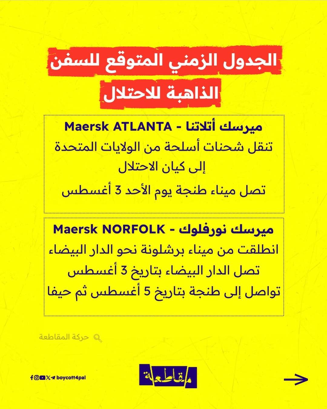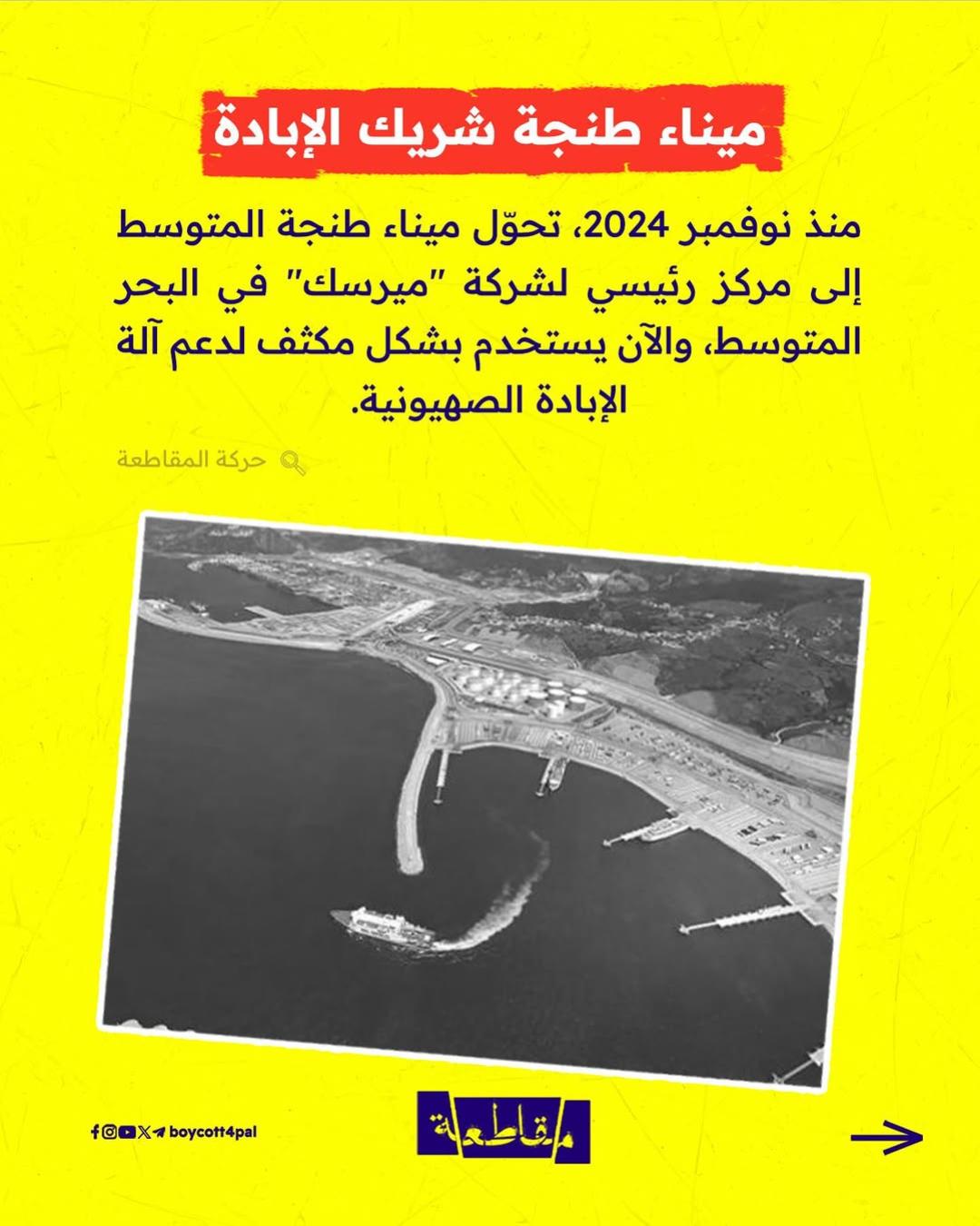 تواطؤ السلطات المغربية في استخدام موانئها كجسر لتمرير السلاح للاحتلال، جريمة تخالف إرادة الشعب المغربي الرافض للتطبيع. ومن هذا المنطلق، دعت حركة المقاطعة (BDS) المغرب إلى وقف هذا التواطؤ الفاضح فورًا، كما أكدت أن عمال الموانئ لا يمكن إجبارهم على المشاركة في هذه الجرائم، وطالبتهم بالامتناع عن تمرير شحنات السلاح.