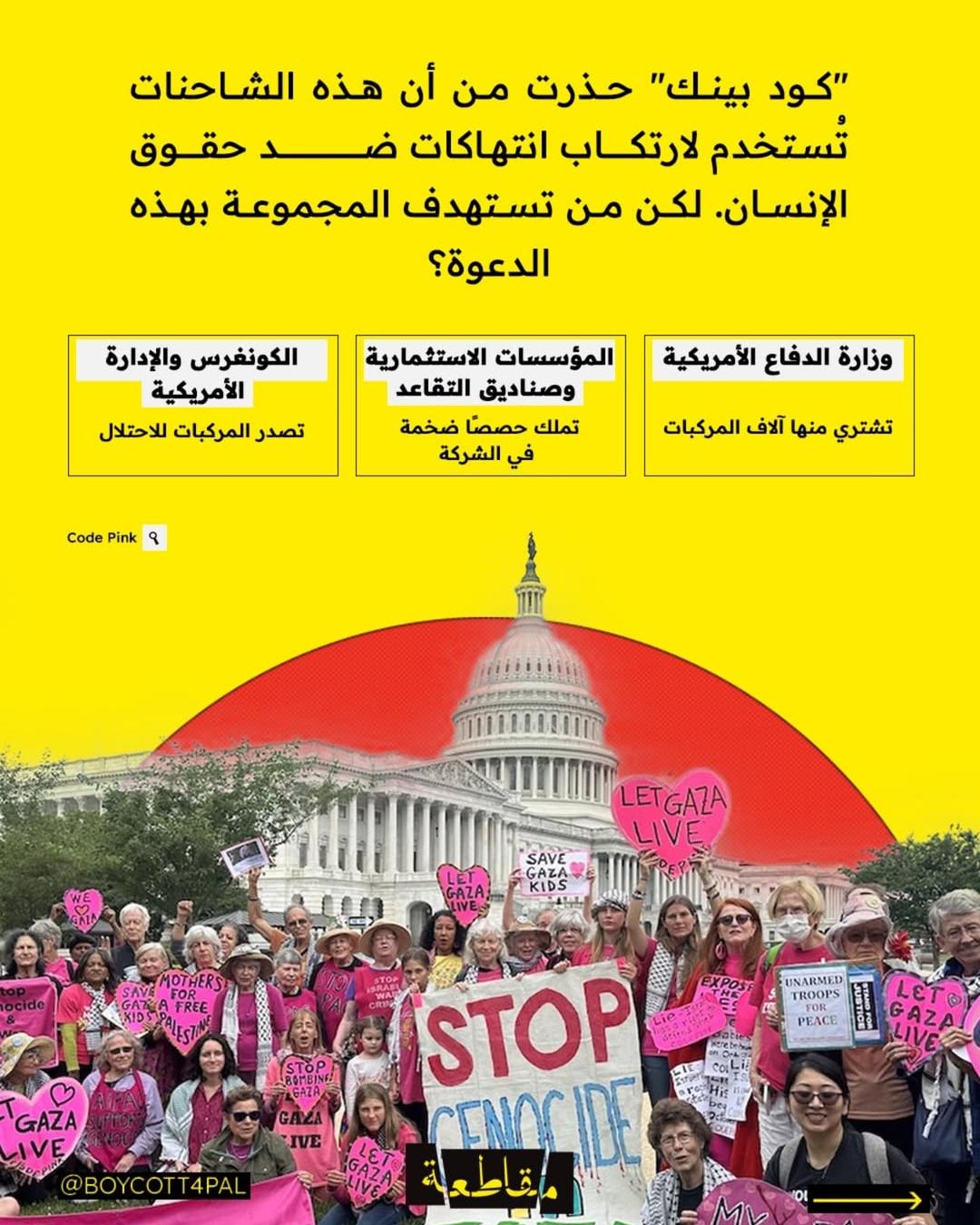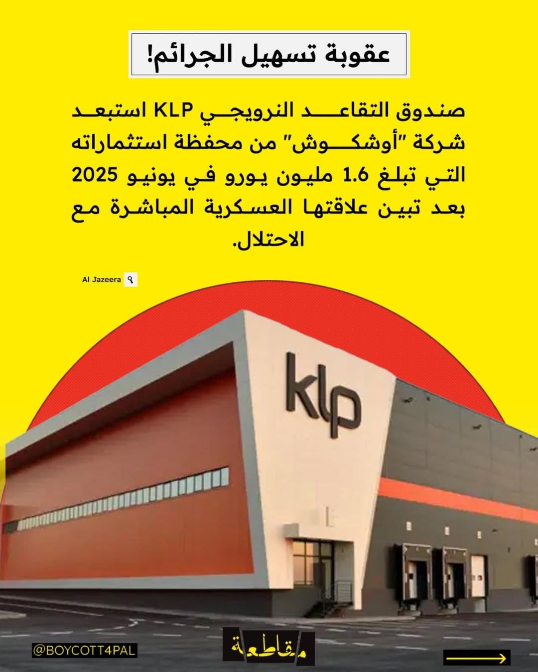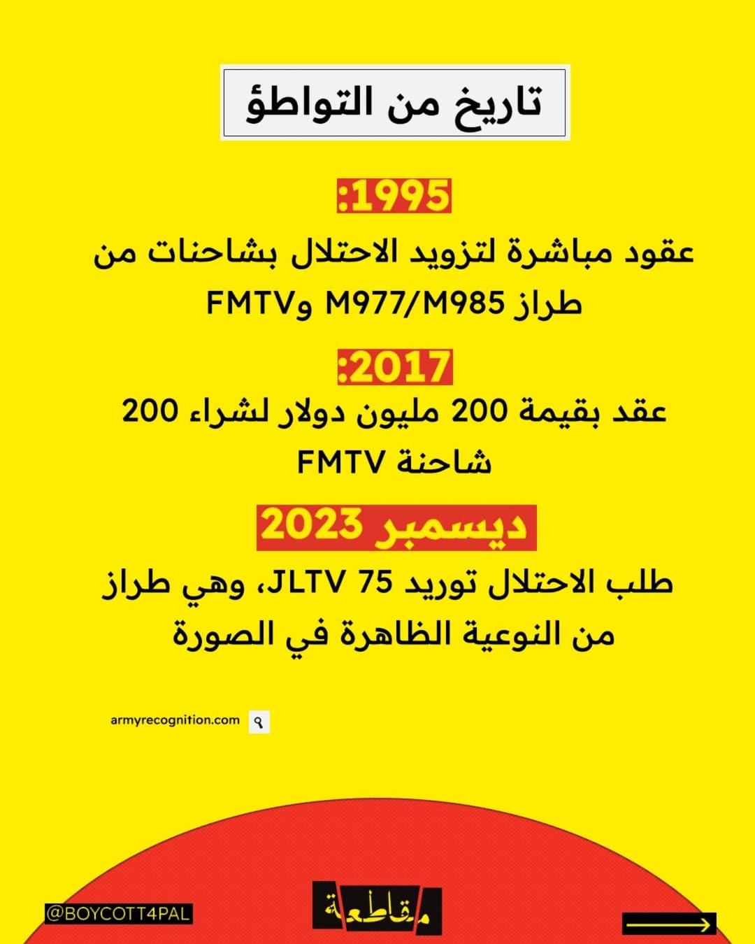 أمريكية مجددًا! شركة تمول الاحتلال بعرباته التي تبدأ من خلالها سلسلة التنكيل بأسرانا الأحرار. "أوشكوش" للمركبات، ذات التاريخ الطويل من تزويد مرتكبي الجرائم بالمركبات والعربات، والتي لم تمنعها الإبادة عن الاستمرار بالتوريد.. حتى أصبحت في مرمى العقاب، حيث قررت النروج سحب الآلاف من استثماراتها فيها. وننتظر من الصناديق ومجالس المدن وكل مستثمر فيها أن يكف عن التواطؤ. ونؤكد على دعوة "كود بينك" بتكبيد هذه الشركة وغيرها الخسائر.