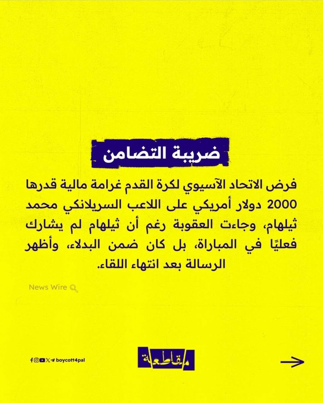 عوقب ثيلهام بغرامة مالية، وكأن التضامن مع قضية إنسانية أصبح جرمًا يُحاسب عليه. قرار الاتحاد الآسيوي لكرة القدم لم يُدن موقفًا سياسيًا، بل أدان فعلًا إنسانيًا لا يحمل إلا الدعاء والرجاء بالحرية لشعب محاصر.
