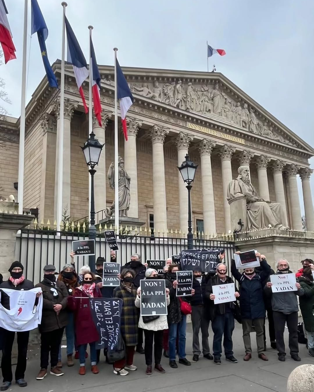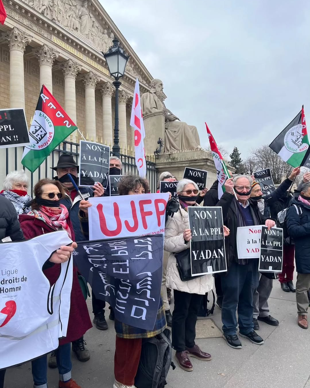 نظّم نشطاء متضامنون مع فلسطين وقفة احتجاجية أمام الجمعية الوطنية الفرنسية (البرلمان الفرنسي) في العاصمة باريس، رفضًا لمشروع قانون يادان الذي يُناقَش ويُصوَّت عليه للمرة الأولى داخل البرلمان. وجاءت الوقفة بدعوة وتنظيم من "شبكة فلسطين في أوروبا" و"جمعية التضامن الفرنسية-الفلسطينية"، حيث رفع المشاركون لافتات كُتب عليها "لا لقانون يادان" و"لا لتجريم التضامن مع فلسطين"، مؤكدين أن انتقاد سياسات "إسرائيل" لا يُعد جريمة ولا معاداة للسامية. ويُعرف مشروع قانون يادان بأنه مقترح تشريعي يهدف إلى توسيع تعريف "خطاب الكراهية" عبر ربط بعض أشكال انتقاد "إسرائيل" أو الدعوة لمقاطعتها بتهم معاداة السامية، وهو ما يشكّل تهديدًا مباشرًا لحرية التعبير، ومحاولة لتجريم التضامن السياسي مع فلسطين وملاحقة النشطاء والجمعيات الداعمة لها.